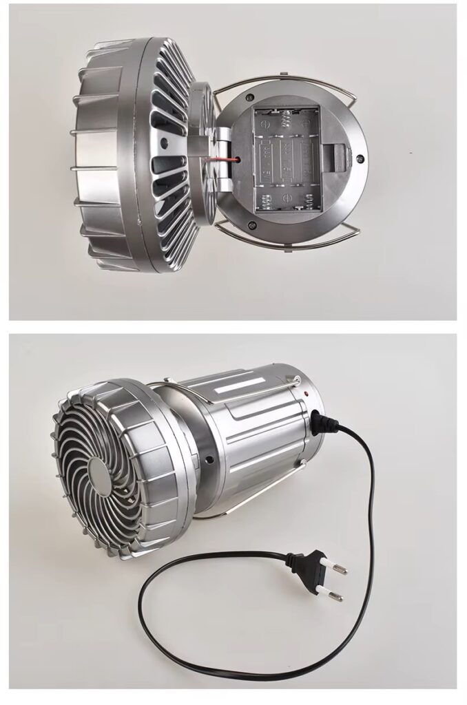 Son ventilateur silencieux offre une ventilation efficace tout en consommant peu d’énergie, tandis que la lampe LED éclaire parfaitement votre espace la nuit. Sa poignée et sa structure robuste permettent de le transporter facilement ou de le suspendre dans une tente.